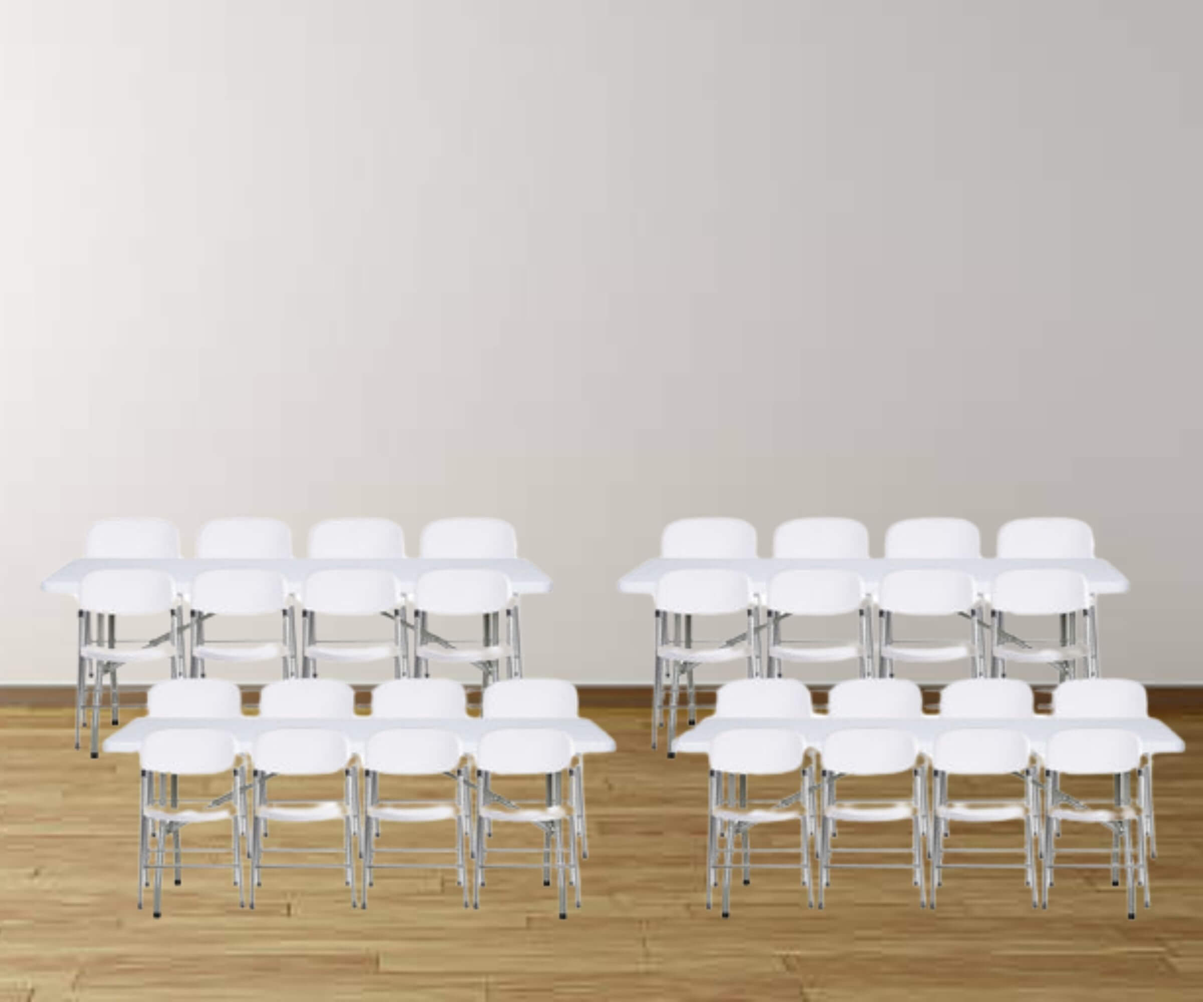 This comprehensive kit equips you with all the essentials to set up 4 separate table arrangements, each accompanied by 8 chairs. It's like having a toolkit of functional elegance, ready to transform any space into a welcoming and practical environment.