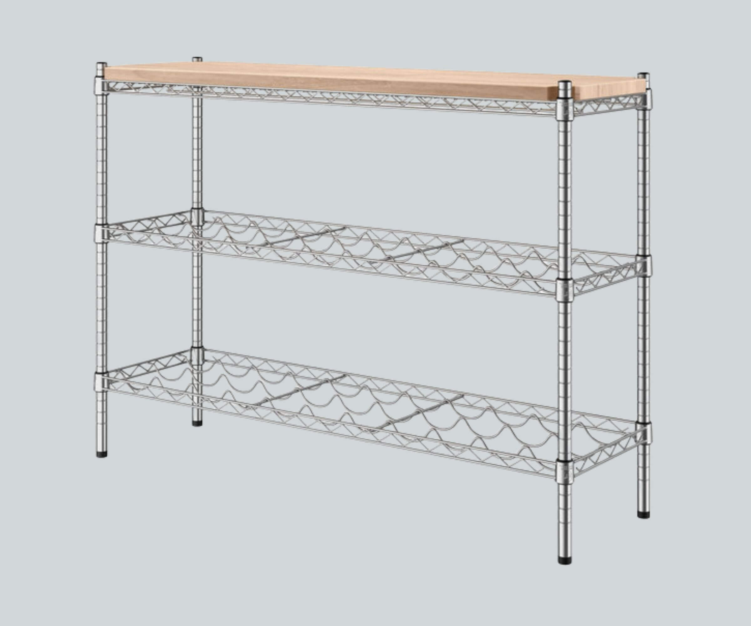 The kit includes two 14" x 48" wire wine shelves and a 14" x 48" NSF chrome wire shelf, meticulously designed to hold up to 11 standard 750 mL bottles on each wine shelf. The grooved shelves securely cradle bottles on their sides, ensuring an elegant display and aiding in flavor retention.