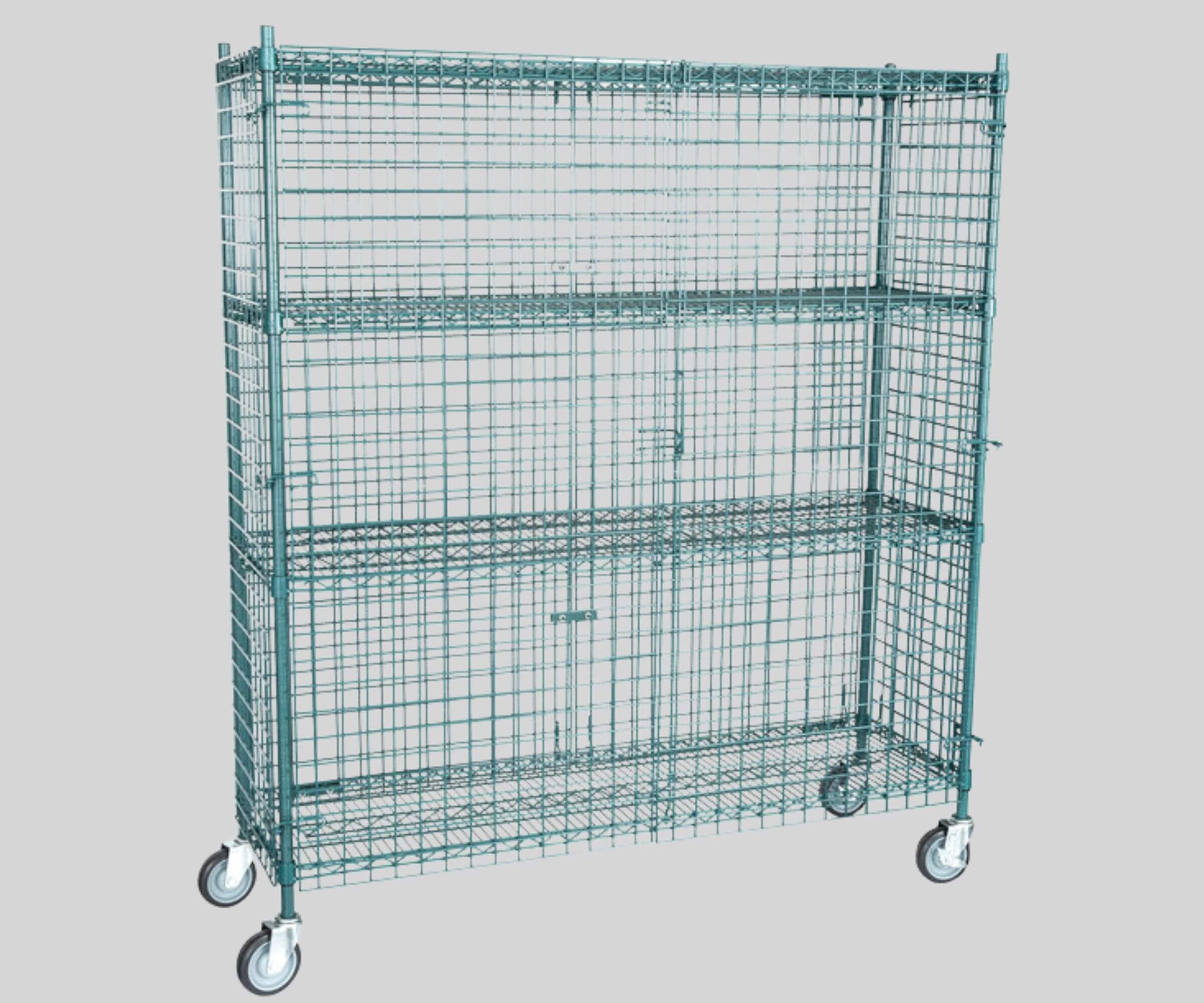 mobile green wire cage, secure storage solution, NSF certified quality, 18x60x69 dimensions, portable storage design, adaptable storage solution, durable green wire construction, mobile security solution, safeguarded items, convenient storage kit.