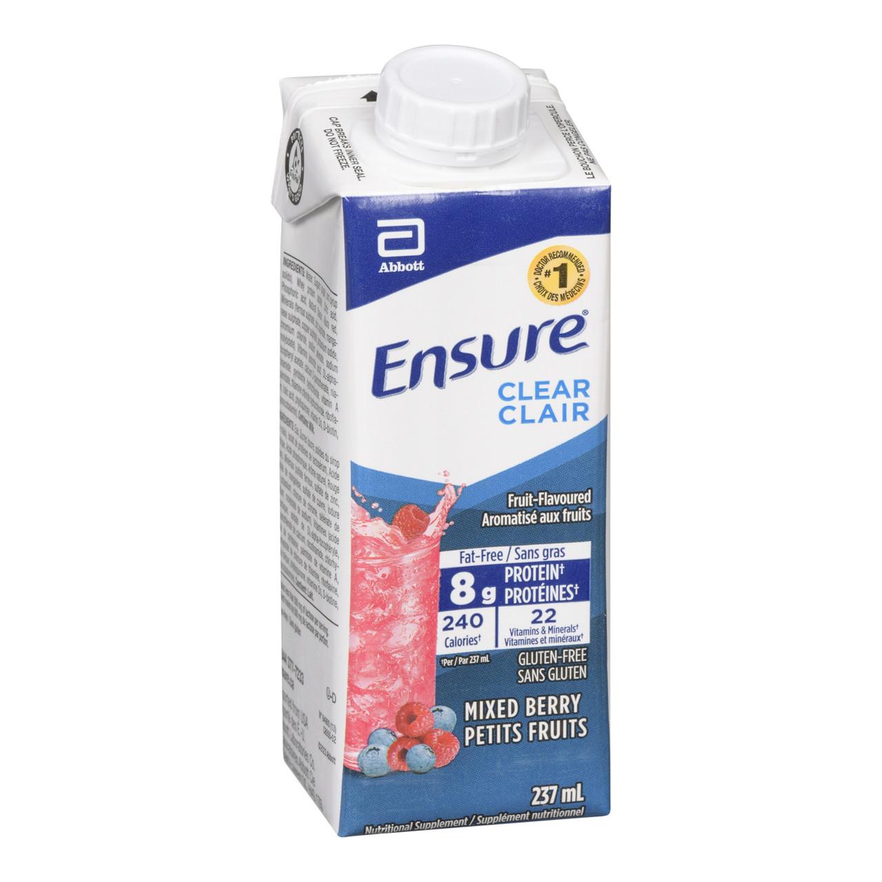Enjoy the light, refreshing taste of Ensure Clear Mixed Berry 237ml/8oz, a premium nutritional supplement designed for those who prefer fruit-flavored, clear beverages over traditional creamy shakes. Each 8oz serving delivers 8g of high-quality protein along with 15 essential vitamins and minerals, supporting muscle health, immune function, and overall wellness. Its fat-free formulation makes it ideal for clear-liquid diets, pre- and post-surgical nutrition, or fat-restricted meal plans. Conveniently packaged in a reclosable 237ml carton, Ensure Clear Mixed Berry is perfect for on-the-go hydration, home use, or recovery care, making nutrition accessible and effortless. Suitable for diverse dietary needs, it is kosher, halal, gluten-free, and lactose-intolerant friendly, ensuring everyone can enjoy a fruity, revitalizing drink. Whether for daily supplementation, care facility use, or travel-friendly nutrition, this mixed berry beverage combines refreshing taste with functional health benefits, providing a practical, enjoyable solution for maintaining wellness anytime, anywhere.