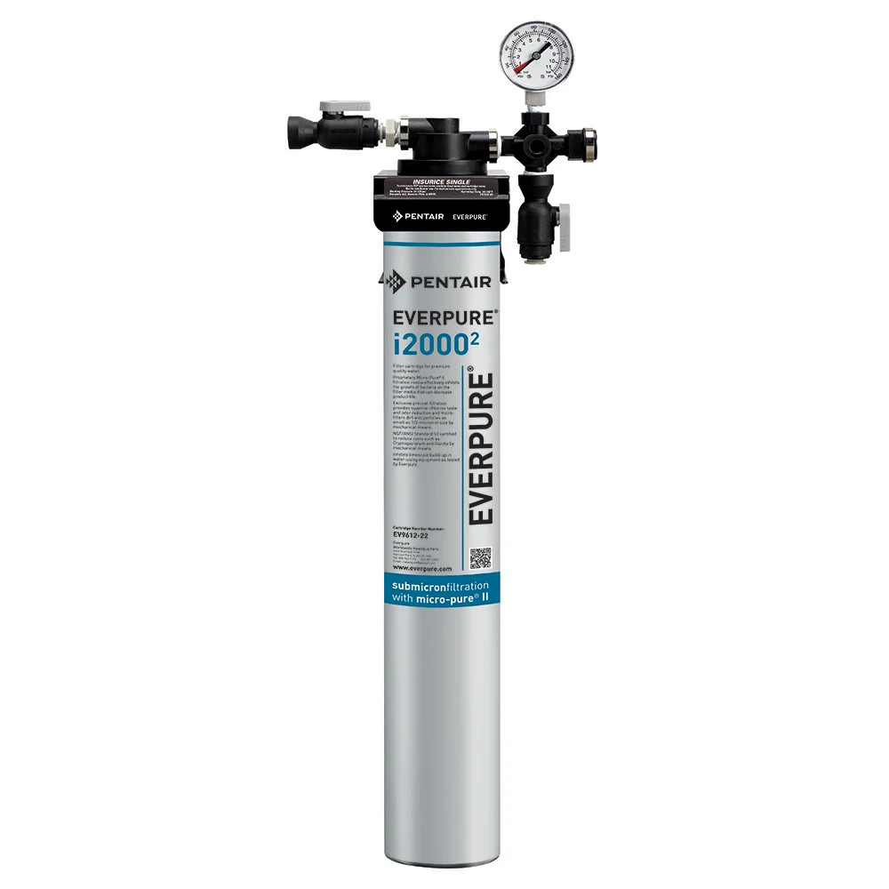 Everpure EV932401, Insurice® i2000², water filter cartridge assembly, high-capacity filtration, flow rate, micron filtration, ice machine, pressure gauge, flushing valve, NSF, ANSI.