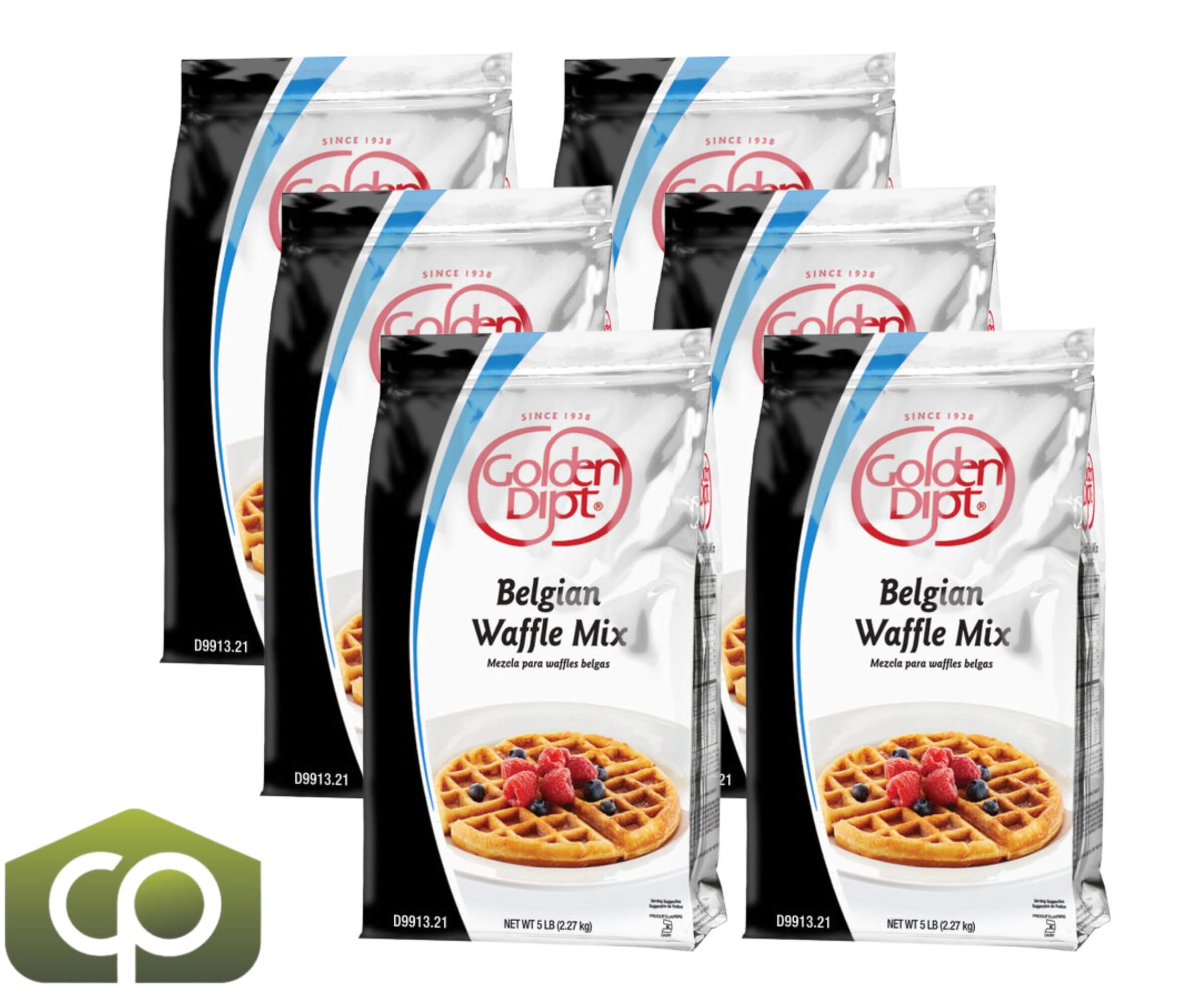 Each package contains 5 lbs. (2.27 kg) of waffle mix, and they are sold in cases of six, ideal for commercial kitchens, restaurants, and catering operations.