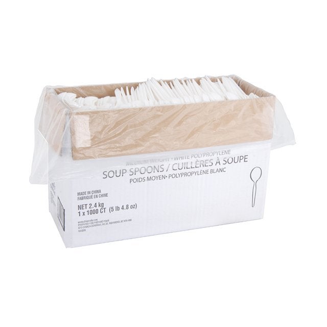 This is a white medium weight polypropylene plastic soup spoon. Packaging & Storage Weight:  2.4 kgs Dimensions:  6.70 x 7.70 x 17.40 inches / 17.02 x 19.56 x 44.20 cm