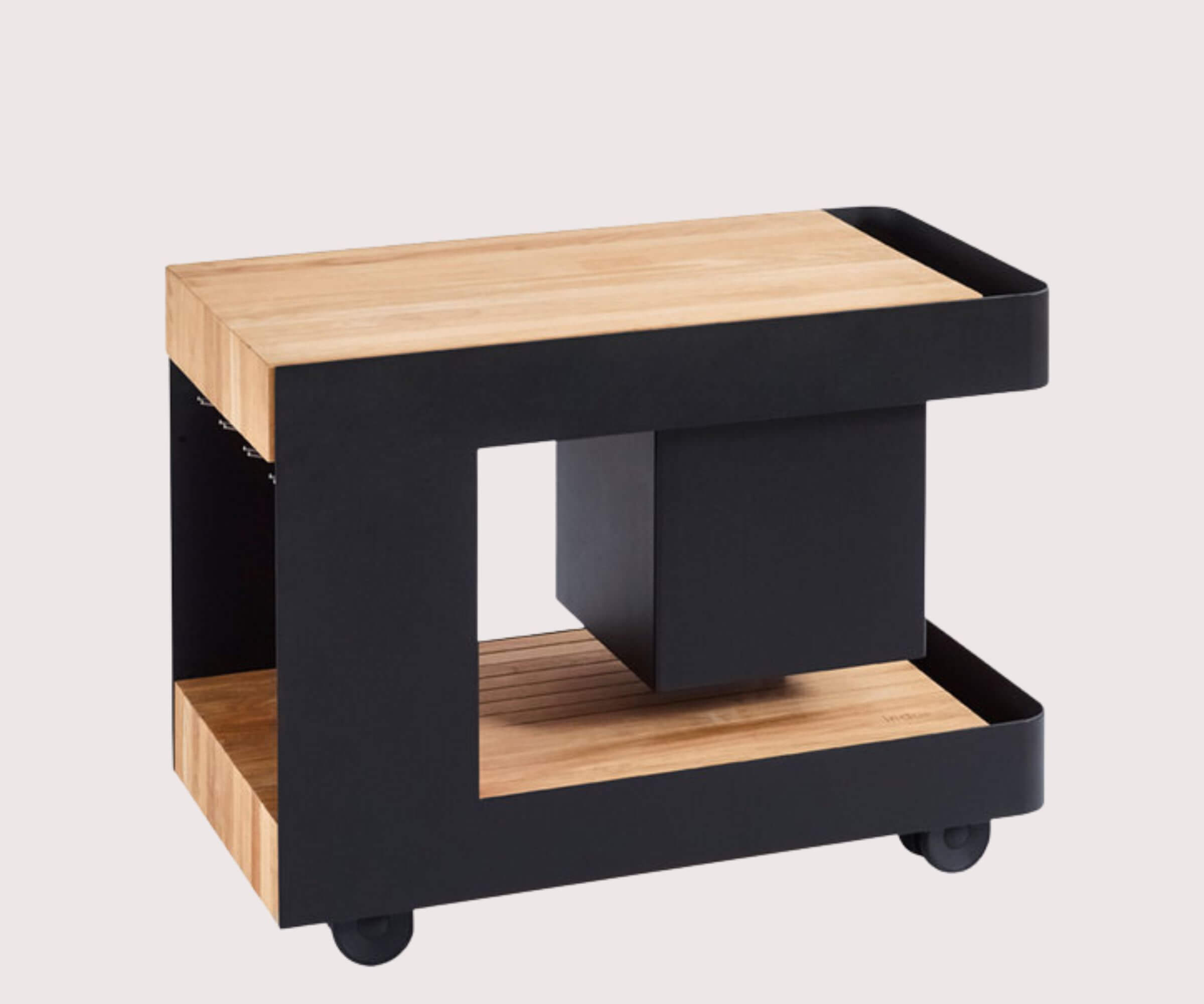 Keep your drinks chilled and customers refreshed in your outdoor space by using this well-constructed Astella INDU-BAR ISLE outdoor mobile bar / side table. This model has a simple yet attractive, contemporary look sure to attract the attention of your guests. It's made from natural sanded, high-quality, grade A teak and matte black powder coated aluminum, making it sturdy for outdoor environments. Plus, the double box with a lid can function as a cooler. Its double-walled, insulated stainless steel construction can keep beverages cool. Or you can fill the cooler completely with ice cubes to create a mobile ice bucket for convenient service!