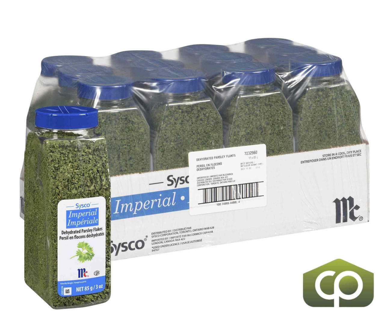 McCormick Imperial Spice Parsley Flakes are a versatile, aromatic herb designed to enhance the flavor of a wide range of dishes. Each 85g (0.19 lbs) container is crafted from high-quality parsley leaves, offering a mild, fresh flavor and pleasant aroma. Sold in a 12-unit case, this packaging is ideal for commercial kitchens, catering services, restaurants, and culinary enthusiasts who need a reliable bulk supply of premium dried parsley.