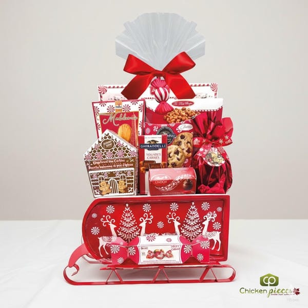 Deliver the ultimate holiday cheer with our Decorative Sleigh Gift Basket, a stunning and reusable metal sleigh filled with a global selection of gourmet Christmas treats. This festive set includes premium delights like Lindt Lindor chocolates from Switzerland, Italian Sant' Angelo Panettone, and French St. Michel Madeleines, all presented in a beautiful sleigh with a ceramic serving tray. It’s the perfect corporate Christmas gift, family present, or festive centerpiece. Order now and make your gifting magical!