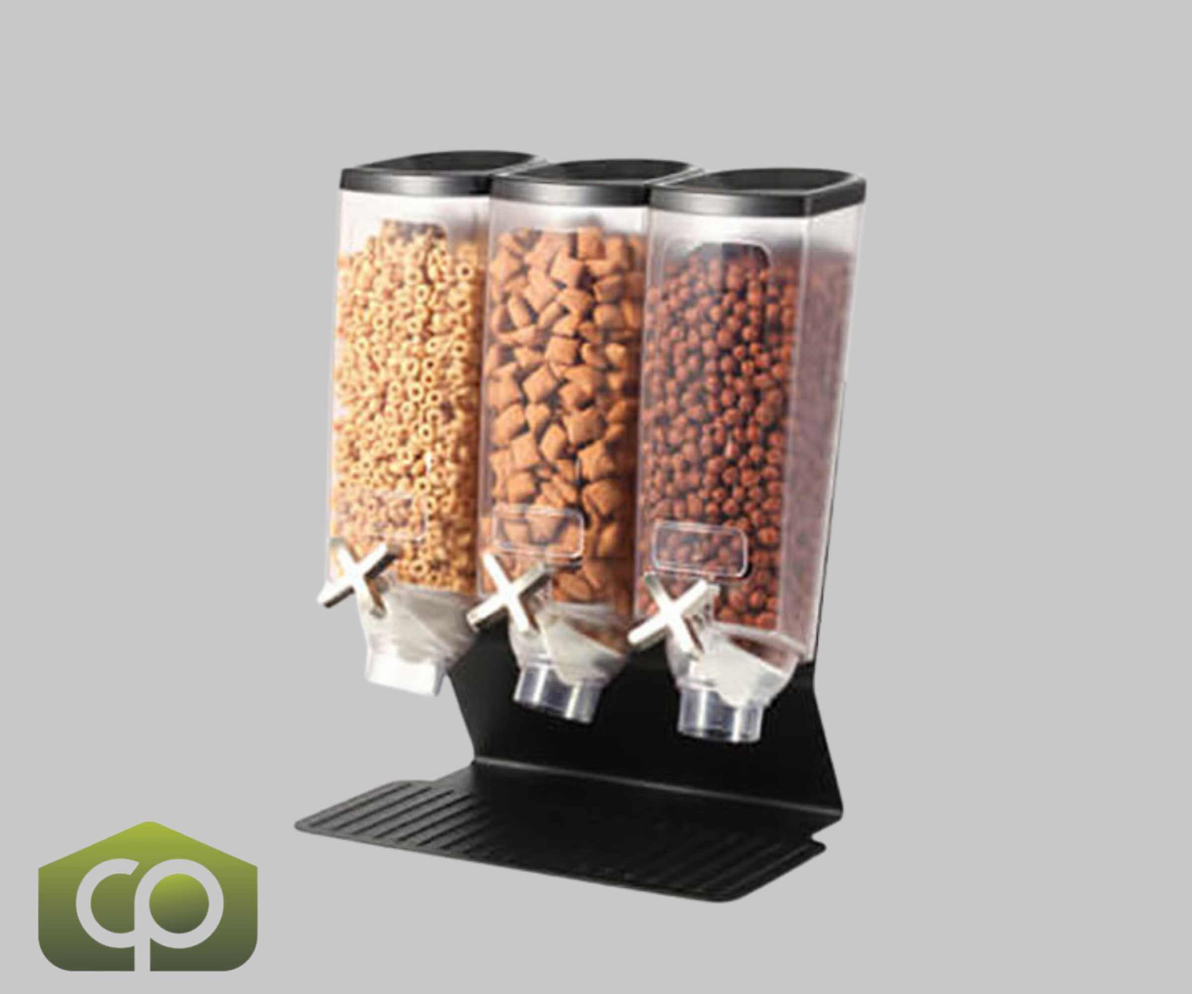 Introducing the Rosseto EZ-PRO Black Steel Stand 3.8 Liter Triple Canister Snack/Cereal Dispenser, a sleek and efficient solution for your snack and cereal presentation. This dispenser features ergonomically-designed ABS plastic canisters for easy product identification and a modern aesthetic.