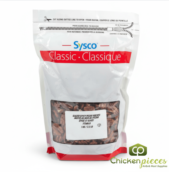 Experience the perfect balance of sweet, spicy, and savory with Sysco Classic Pecan Half Glazed Spicy 1 KG / 2.2 lbs. Each pecan half is carefully roasted in traditional copper kettles, delivering a golden-brown crunch with a bold, explosive flavor that excites every bite. This premium-quality pack is ideal for home snacking, parties, holiday entertaining, or professional culinary use. The generous 1 KG / 2.2 lbs bag ensures you have enough to use as a standalone snack, salad topper, or ingredient in baked goods like cookies, muffins, and pies. Packaged in a nitrogen-flushed, resealable bag, these pecans stay fresh, crunchy, and full of flavor for longer. Perfect for chefs, caterers, or anyone who loves a gourmet snack with a hint of heat, Sysco Classic Spicy Glazed Pecans combine convenience, taste, and premium quality in every bite.