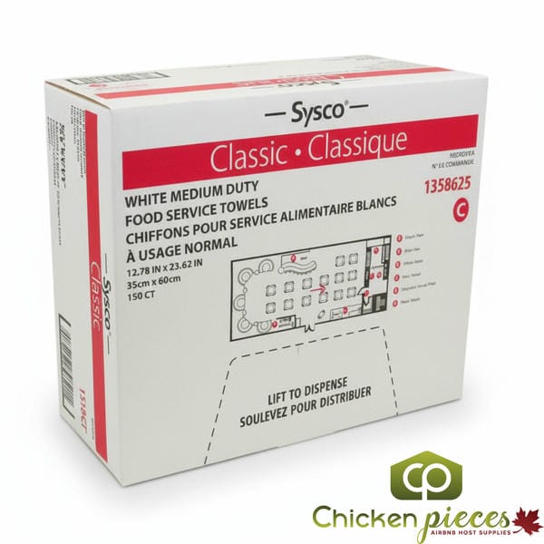 The Sysco Classic White Medium Duty Towel Wipers are designed to meet the high demands of restaurants, cafeterias, catering operations, and busy kitchens. Measuring 23.62" × 13.8", these towels provide a generous surface area for quickly absorbing spills, cleaning surfaces, and maintaining hygienic workstations.